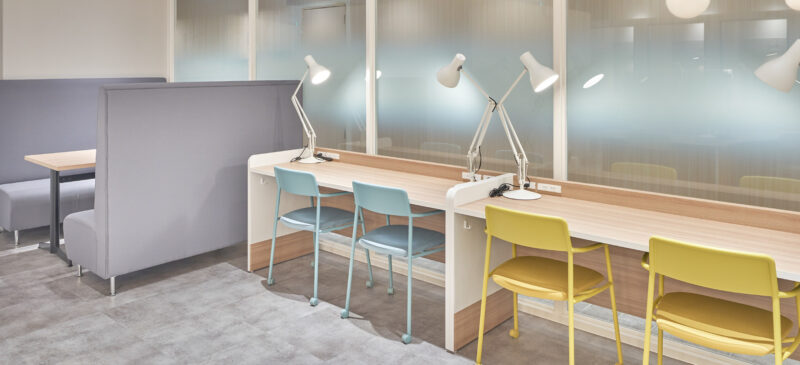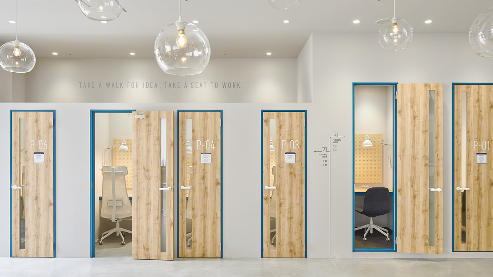 カフェよりも集中できて、自宅よりも快適に過ごせる。幅の広いテーブルやワークチェアなど、ハカドルための空間づくりにこだわりました。