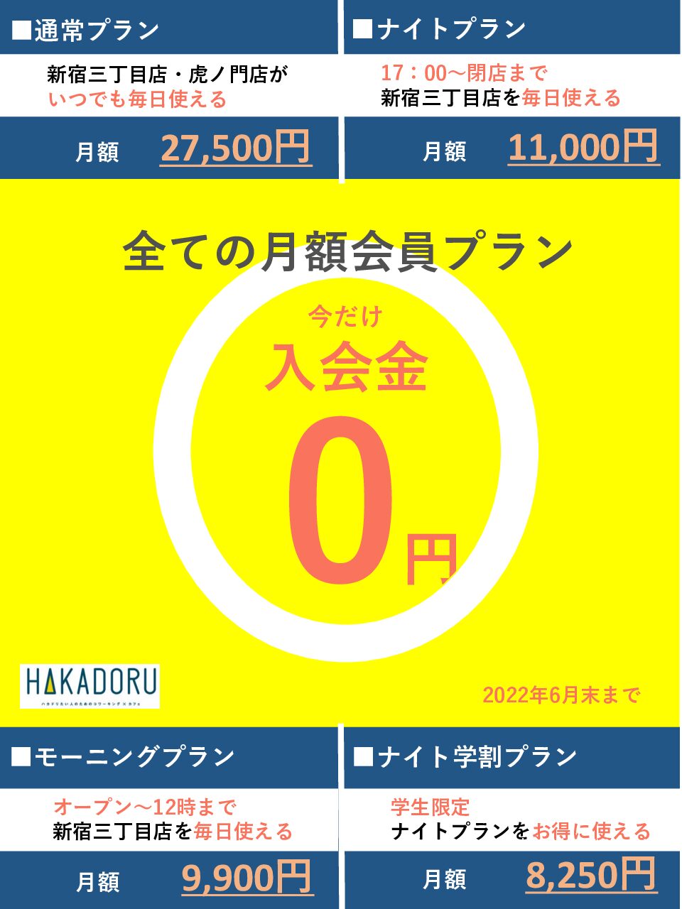 2022.06.09 月額入会金無料キャンペーン 実施中 新橋虎ノ門店新宿三丁目店 いつもHAKADORUをご利用いただきありがとうございます。 全ての月額プランを対象に 入会金無料でご入会いただるキャンペーンを実施中! ★2022年6月30日まで★ 【対象店舗】 HAKADORU虎ノ門店・HAKADORU新宿3丁目店 【対象月額プラン】 通常月額プラン、法人月額プラン モーニング月額プラン、ナイト月額プラン、ナイト学割月額プラン ※モーニング月額プラン、ナイト月額プラン、ナイト学割月額プランは 新宿三丁目店限定の月額プランとなっています