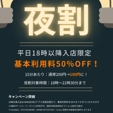 新宿三丁目店 【平日限定】夜割キャンペーンスタート! 18時以降のご入店で利用料半額!!